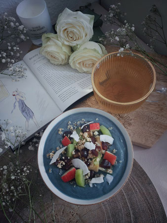 1 Banane 1 Kiwi 1 Apfel 3 Datteln (entkernt) 1/2 Mango 250 ml Kokosmilch (60% Kokosanteil) 1 TL Blaues Spirulina Pulver Topping: Einige Apfel- und Kiwistücke 2 Datteln (klein geschnitten) Kokoschips Granola (beliebig)
